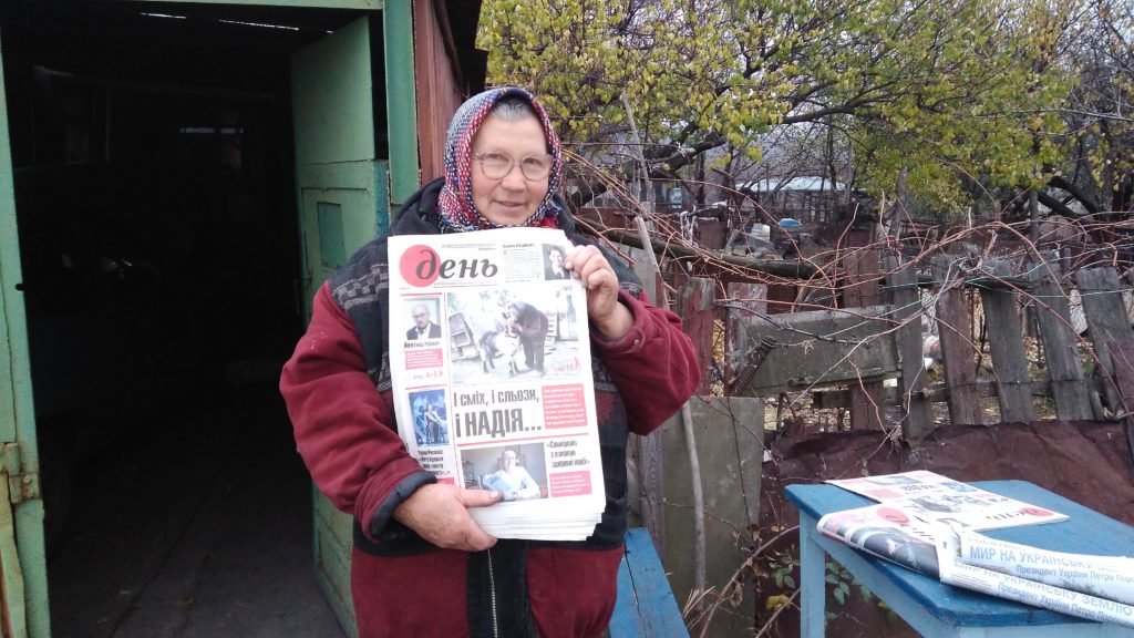 В четверг 26 октября развезла 14000 украинских газет «Вісті Донбасу» и «День» по прифронтовым городам и сёлам Донецкой области: Марьинка, Красногоровка, Авдеевка, Торецк, Верхнеторецкое, Новгородское, Красногоровка (Ясиноватский район), Керамик, Новосёловка, Новобахмутовка, Уманское, Карловка, Троицкое, Александрополь, Георгиевка, Максимильяновка и Желанное.