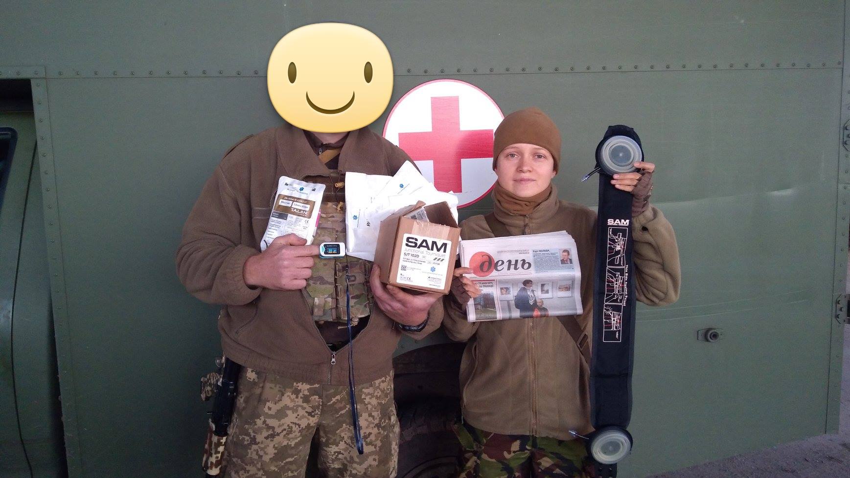 Передала медикам на передовую узловой турникет SAM, катетер костного доступа, окклюзионные наклейки, пульсоксиметр и газеты «День»!
