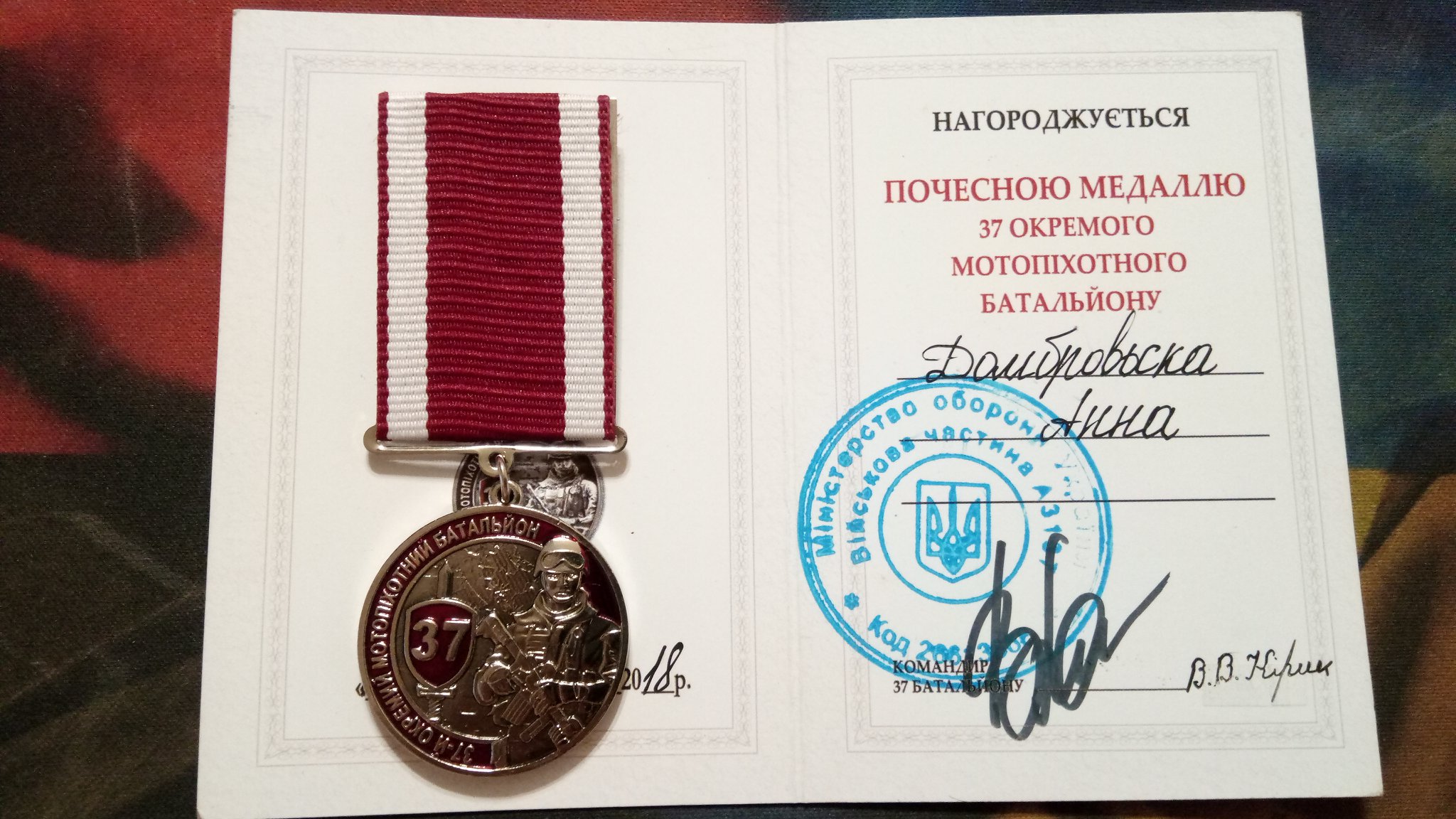 Получила почетную медаль от командования 37 ОМБ за помощь медикам батальона!