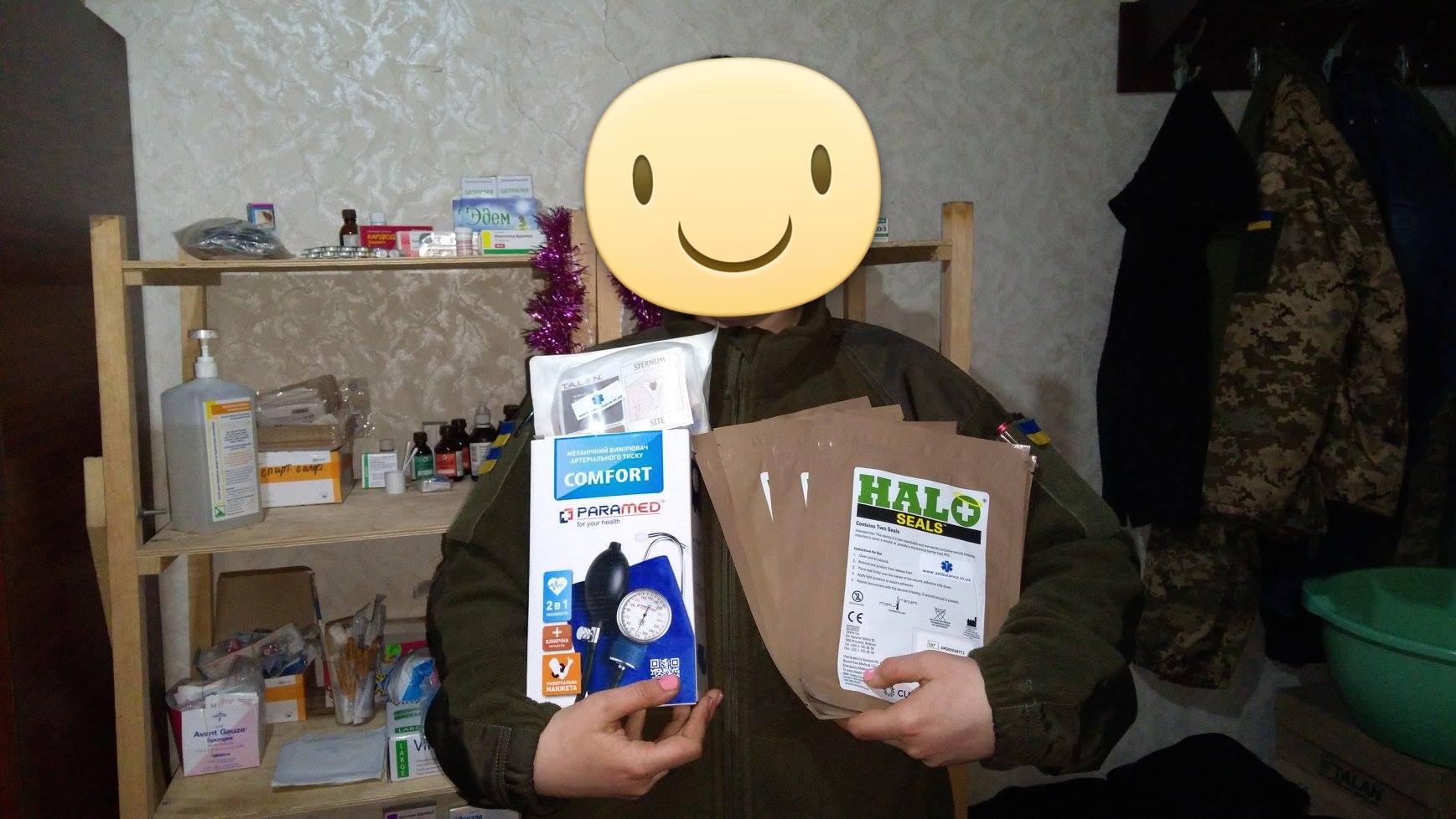 Передала военным медикам катетер костного доступа, окклюзионные наклейки HALO и тонометр.