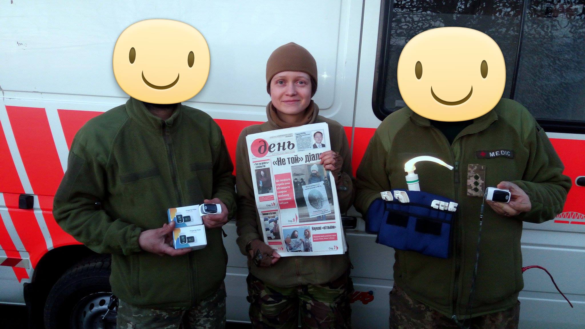 Передала военным медикам пульсоксиметры, ларингоскоп, систему костного доступа FAST 1, узловой турникет SAM, окклюзионные наклейки Halo, противоожоговые бинты, мягкие носилки и газеты «День»!