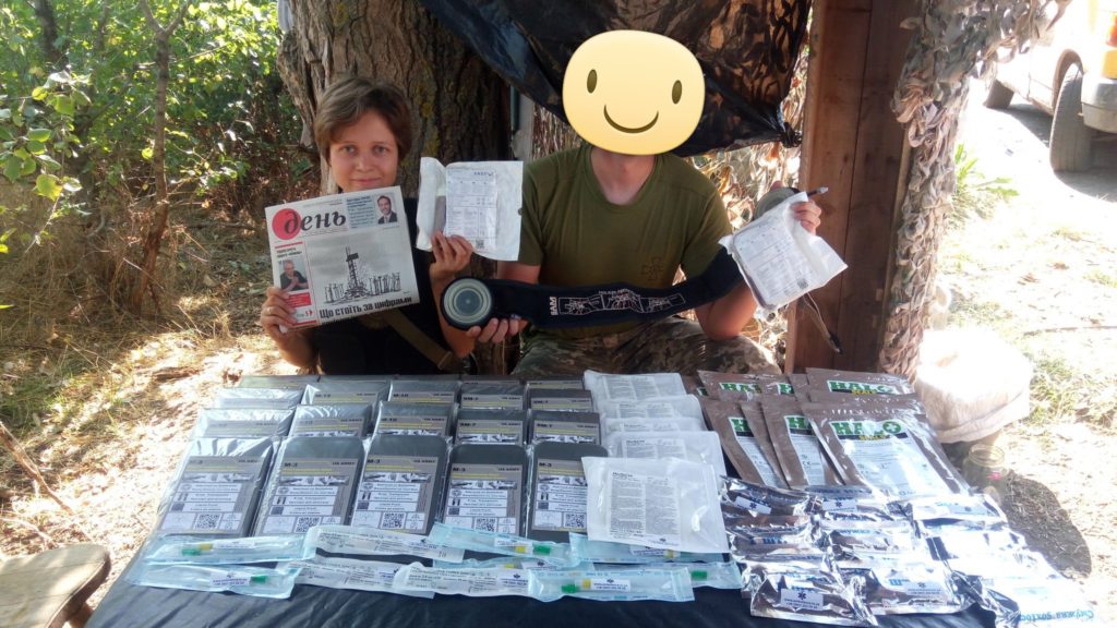 Доставила медикам на передовую 4 медицинских тактических рюкзака Velmet, 3 ампульницы UTactic, узловой турникет SAM, 2 системы внутрикостного доступа FAST1, 10 декомпрессионных игл, 15 окклюзионных наклеек Halo, 6 окклюзионных наклеек с клапаном Asherman ACS, 18 мягких носилок, 15 противоожоговых бинтов, 24 тактические шины разных размеров, пояс тактический T-Pod, противошоковые штаны Anti Shock Trousers. Всего на сумму около 60000 гривен!!!