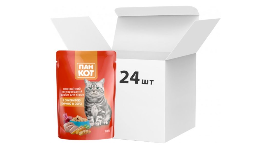 Всего 108 гривен за упаковку влажного корма «Пан Кот» (24 пакетика по 100 грамм)!
