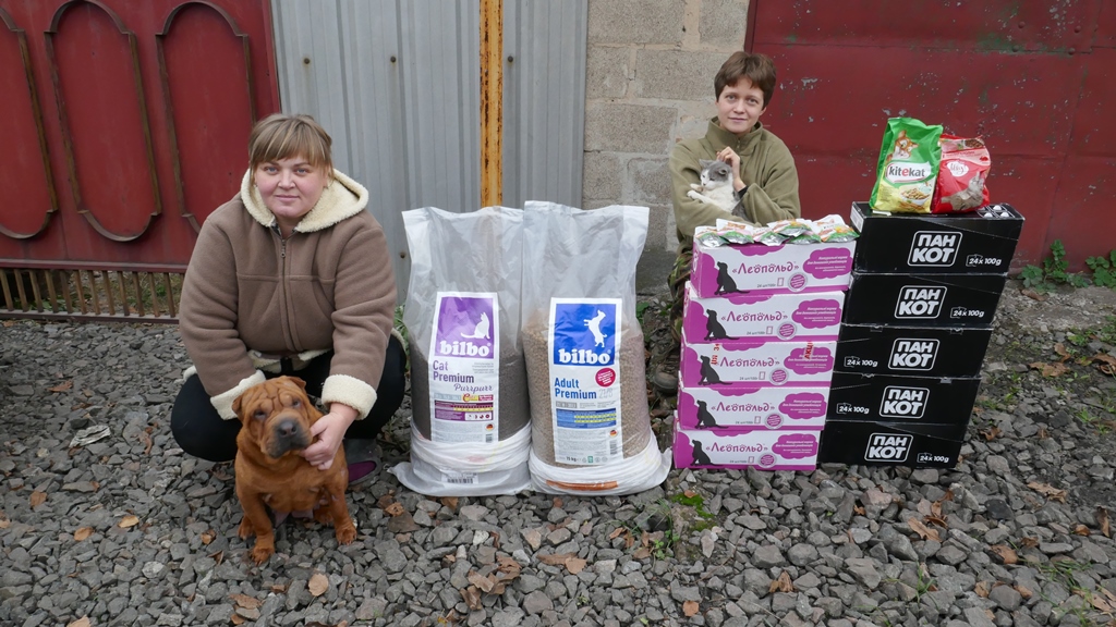 В конце октября доставила Светлане Остапковой сухой корм «Bilbo«, «Kitekat» и «Мяу» для бездомных кошек и собак, а так же мягкий корм для кошек «Леопольд«, «Пан Кот» и «Корм для котів«!