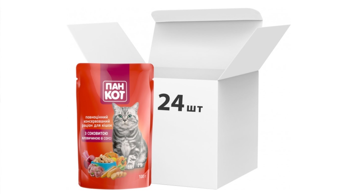 Всего 108 гривен за упаковку влажного корма «Пан Кот» (24 пакетика по 100 грамм)!