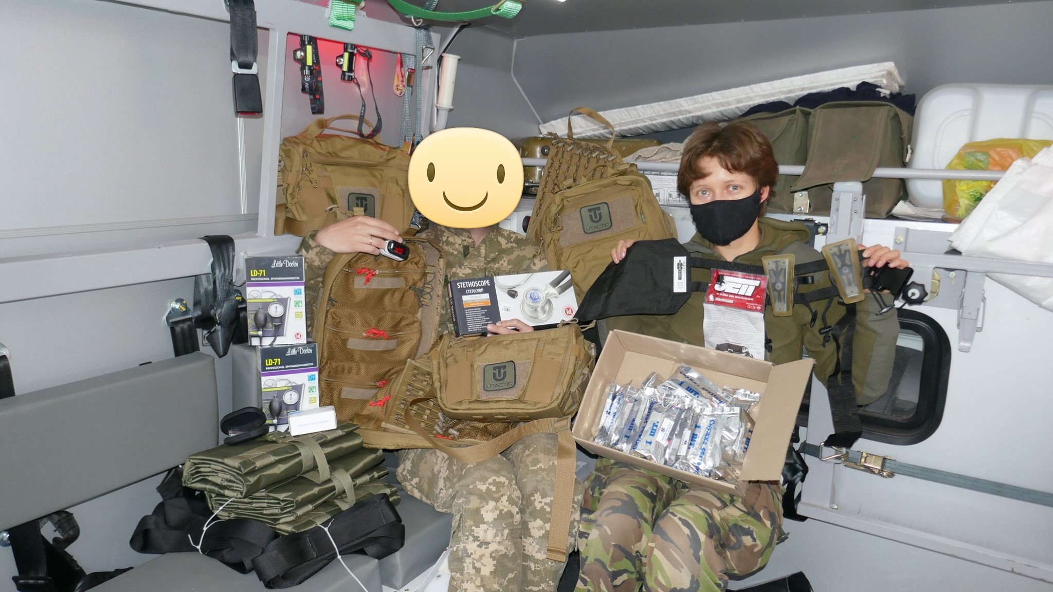 ✅ Доставила медикам на передовую: узловой турникет JETT, два медицинских тактических рюкзака Utactic, три медицинские тактические сумки Utactic, два мешка АМБУ Cyclone pocket BVM, две ампульницы Utactic, двое тактических носилок Utactic со стропой и карабином, пять мягких носилок, три эвакуационные стопы-кольца, шестнадцать противожоговых бинтов, стетоскоп, пять тонометров, одну американскую водонепроницаемую ампульницу, одну маску I-Gel, четыре накладки на глаз, два пульсоксиметра, двое тактических ножниц, два налобных фонарика, два комплекта тактических шин, три венозных жгута BOA, медицинские перчатки, а также комплект летних шин!