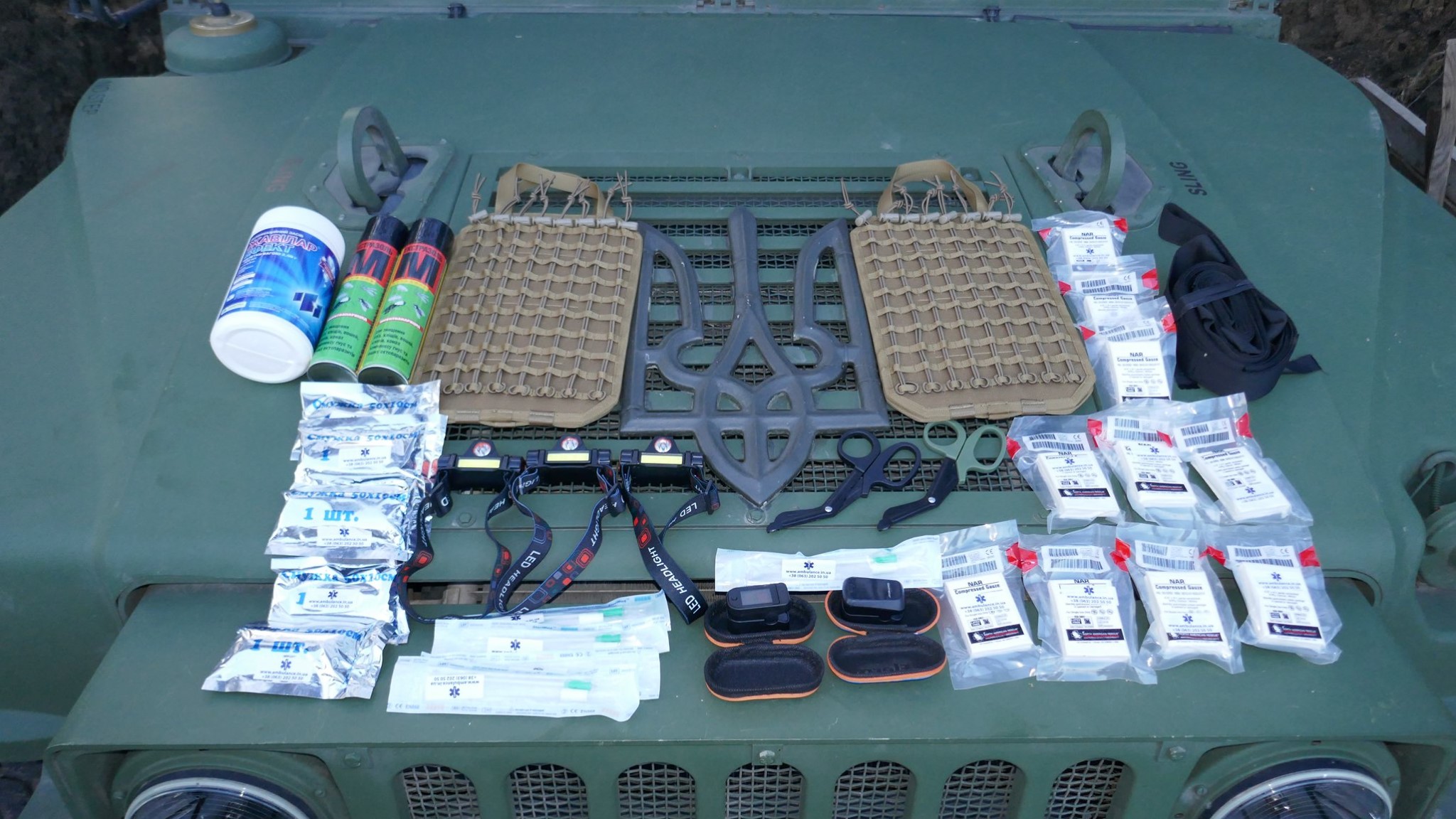 25 бинтов для тампонады NAR, 6 мягких носилок, 6 налобных фонариков, 10 тактических шин разных размеров, 5 декомпрессионных игл, 6 кольцевых строп, 2 тактических ножниц, 2 банки хлорных таблеток, 2 аэрозоля от насекомых, 2 сумки для капельниц, 4 американских бандажа, израильский бандаж №12 и запчасти для ремонта Скорой VW LT!