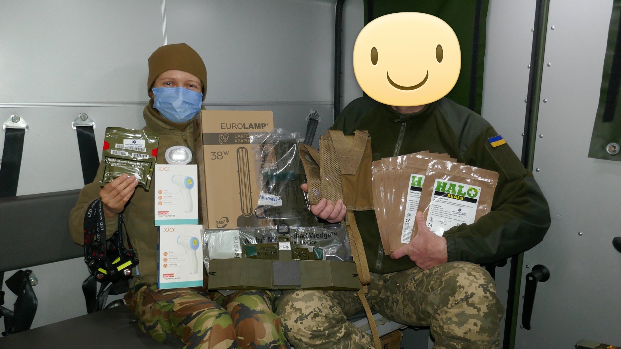 Кроме бактерицидных ламп медики получили: 3 бесконтактных термометра, систему внутрикостного доступа Fast 1, 10 окклюзионных наклеек Halo, 34 противоожоговых бинта, 10 щитков на глаз, венозный жгут BOA, 2 подсумка для капельниц, 3 подголовника Ambu, 9 налобных фонариков, 5 литров антисептика, 2 пульсоксиметра, тонометр, 2 зимних маскировочных сети, панель-органайзер для медпункта, 3 мягких носилок, хирургические бинты и пластыри!
