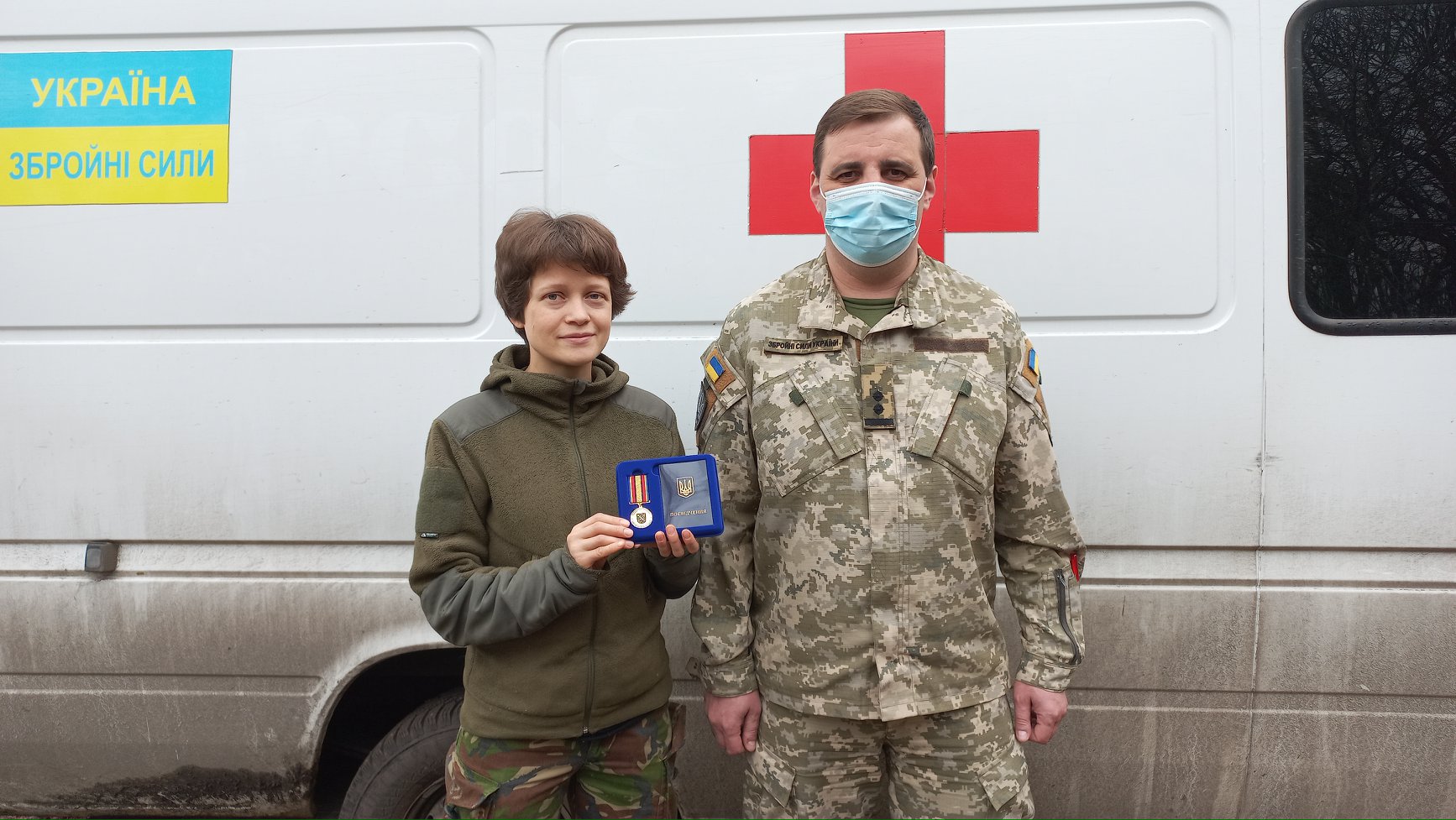 Получила от командира группы Гуманитарного проекта ВСУ «Эвакуация 200» отличие командующего объединенных сил — медаль «Операція Об`еднаних Сил. За Звитягу та Вірність«!