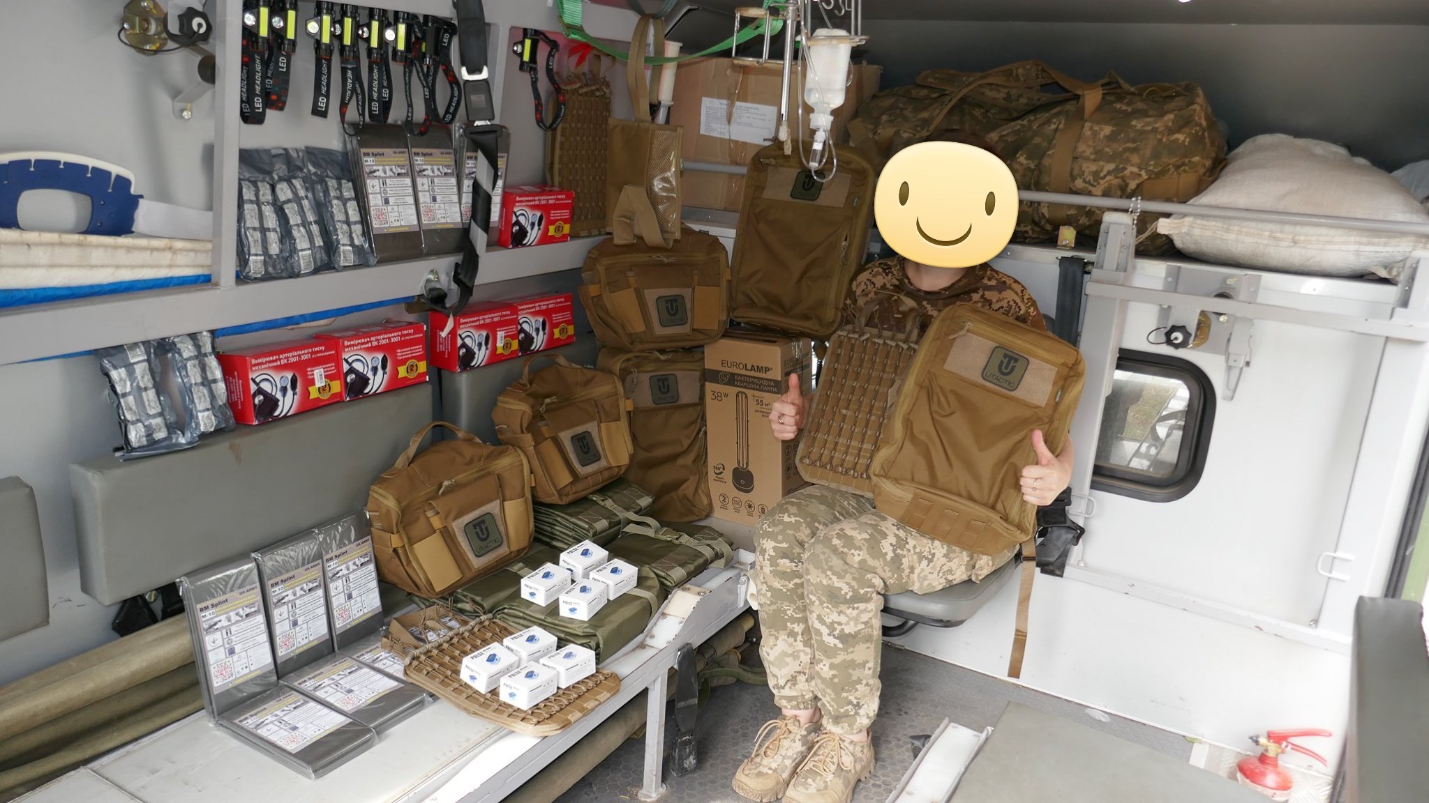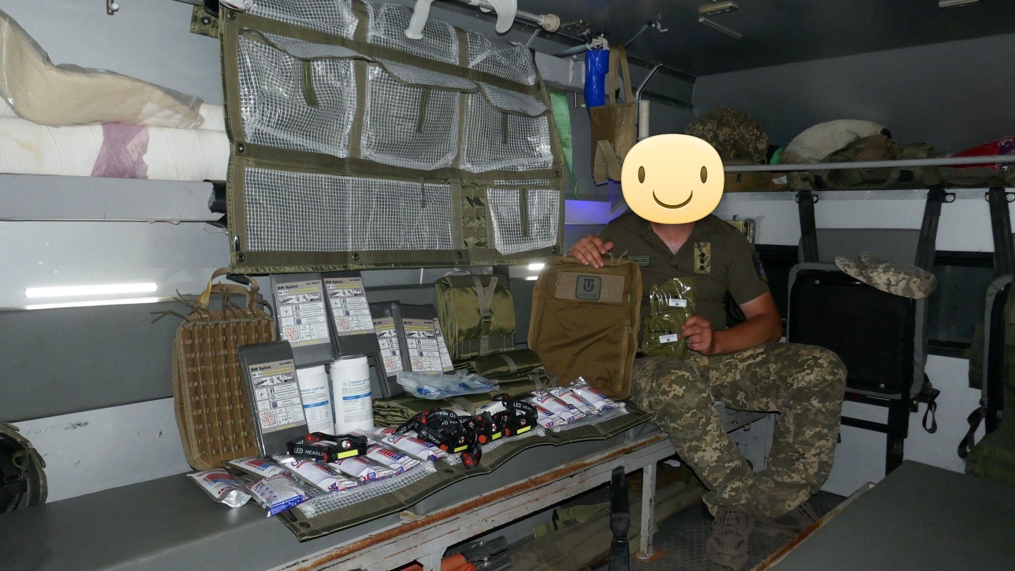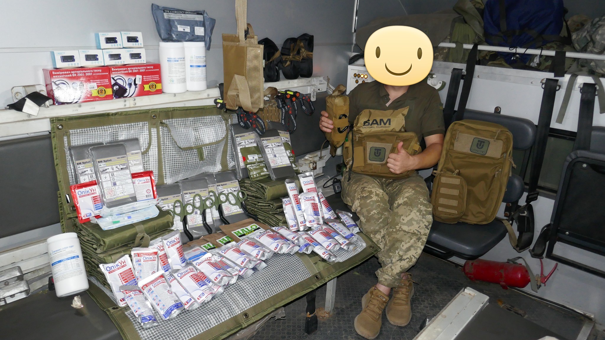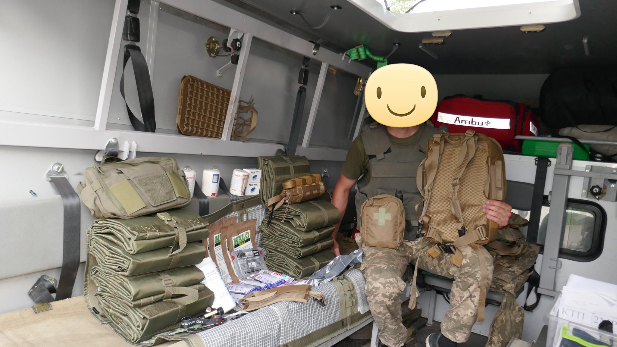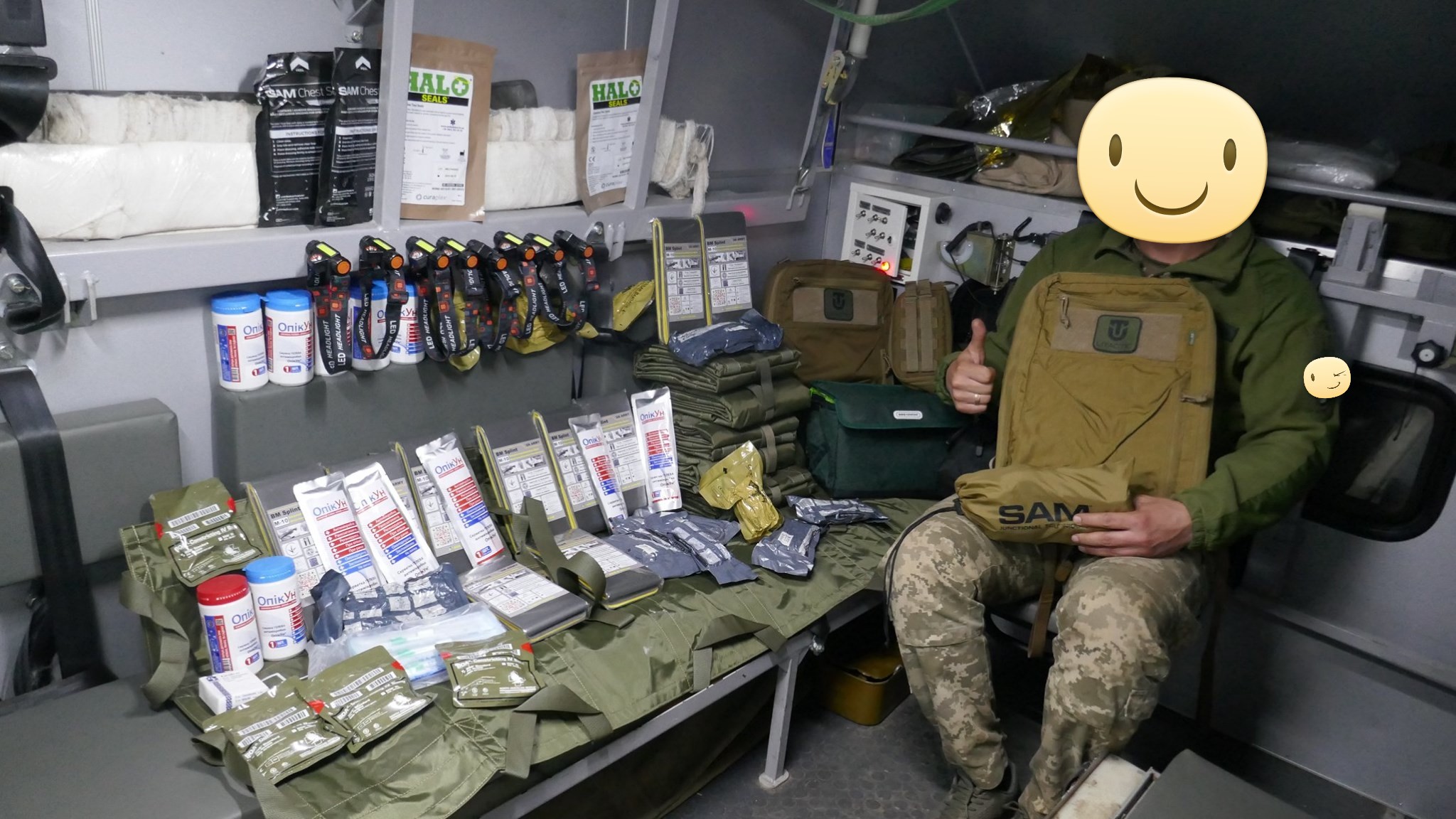 Кроме крутых рюкзаков и сумок фронтовые медики получили: 40 узловых турникетов SAM, более 100 лучших в мире венозных жгутов BOA, более 400 мягких бескаркасных носилок, 1000 противоожоговых бинтов, десятки масок I-GEL, 40 переносных бактерицидных ламп, более 400 налобных фонариков, почти 400 пульсоксиметров, сотни окклюзионных наклеек HALO, более 600 тактических шин разных размеров, 4 автоматических деффибриллятора и многое многое другое! На фото лишь малая часть нашей с вами работы!