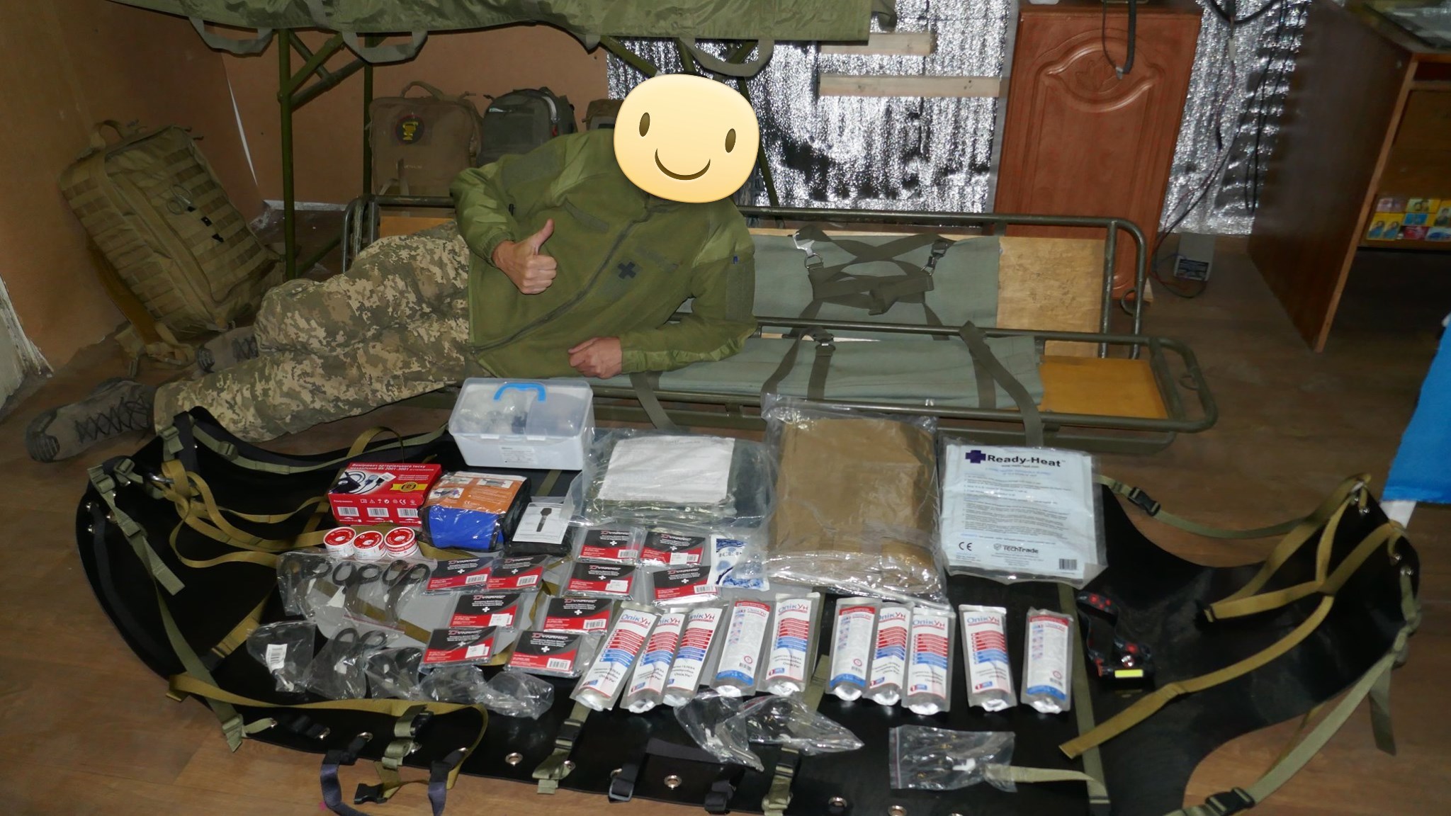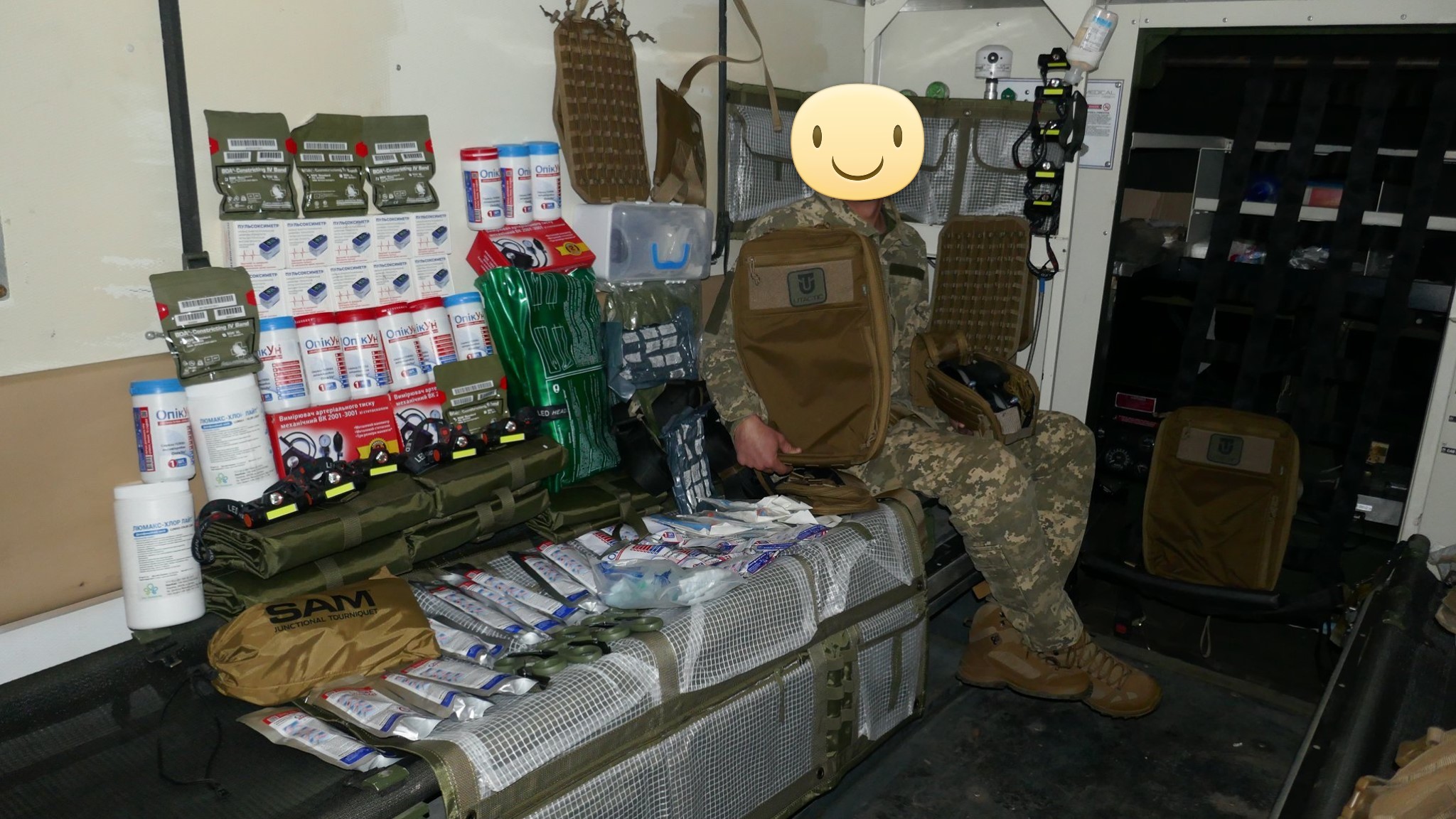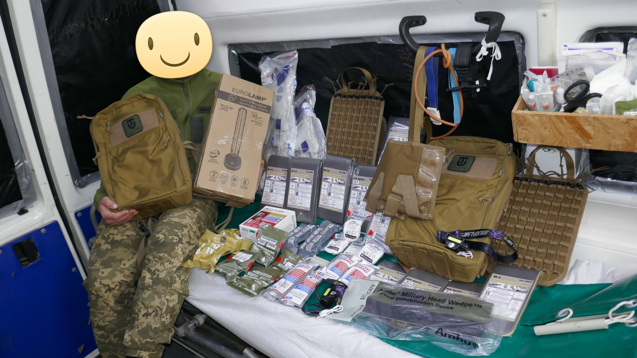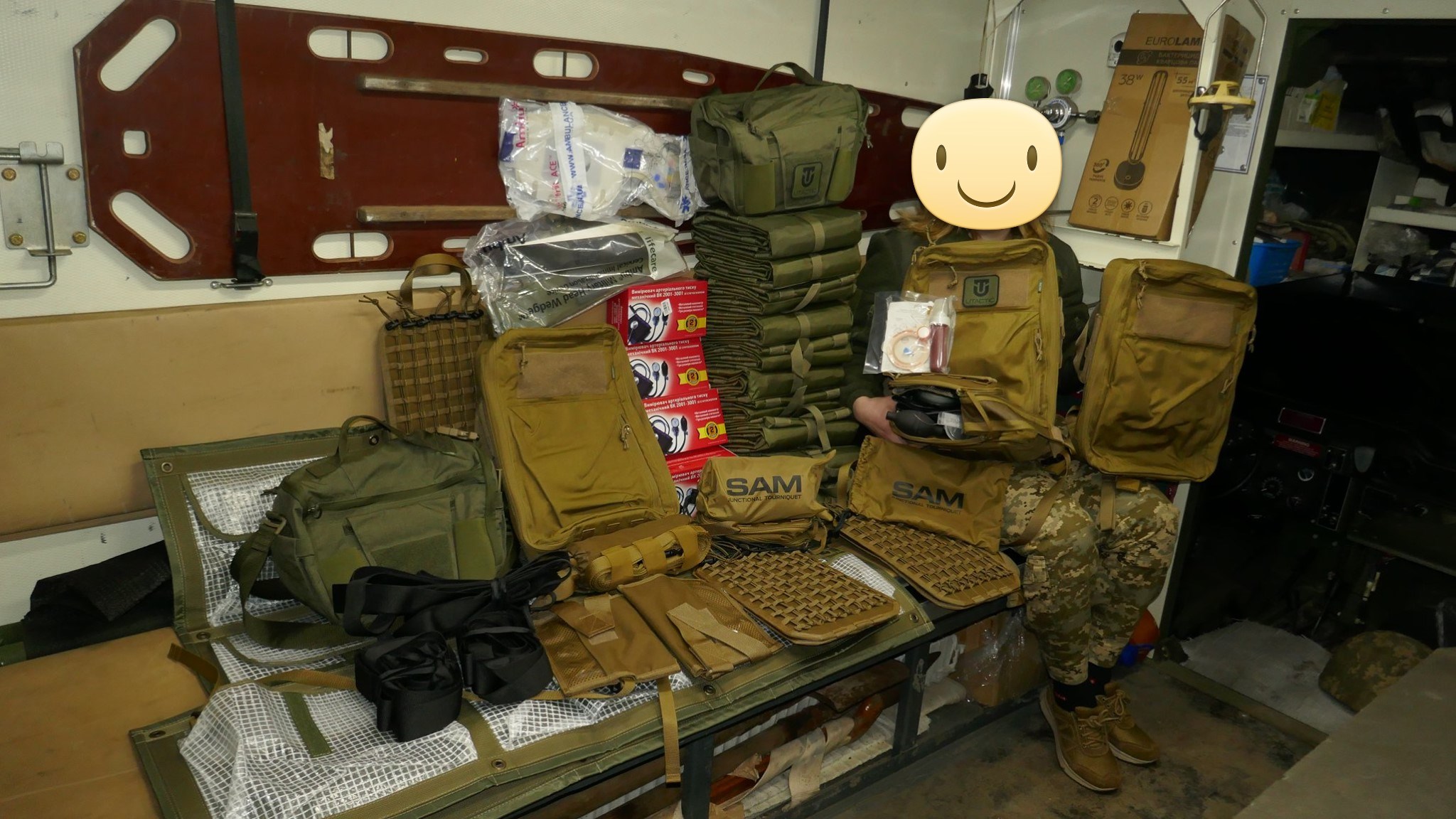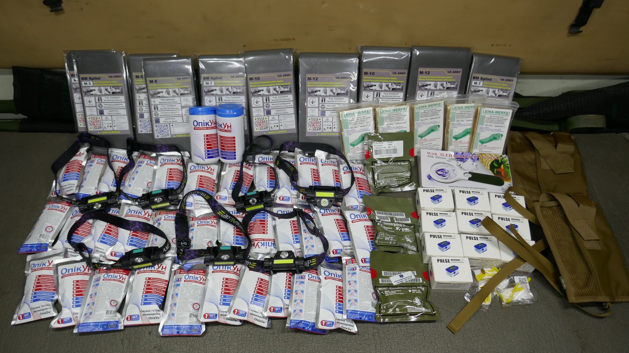 Кроме крутых рюкзаков и сумок фронтовые медики получили: 40 узловых турникетов SAM, более 100 лучших в мире венозных жгутов BOA, более 400 мягких бескаркасных носилок, 1000 противоожоговых бинтов, десятки масок I-GEL, 40 переносных бактерицидных ламп, более 400 налобных фонариков, почти 400 пульсоксиметров, сотни окклюзионных наклеек HALO, более 600 тактических шин разных размеров, 4 автоматических деффибриллятора и многое многое другое! На фото лишь малая часть нашей с вами работы!