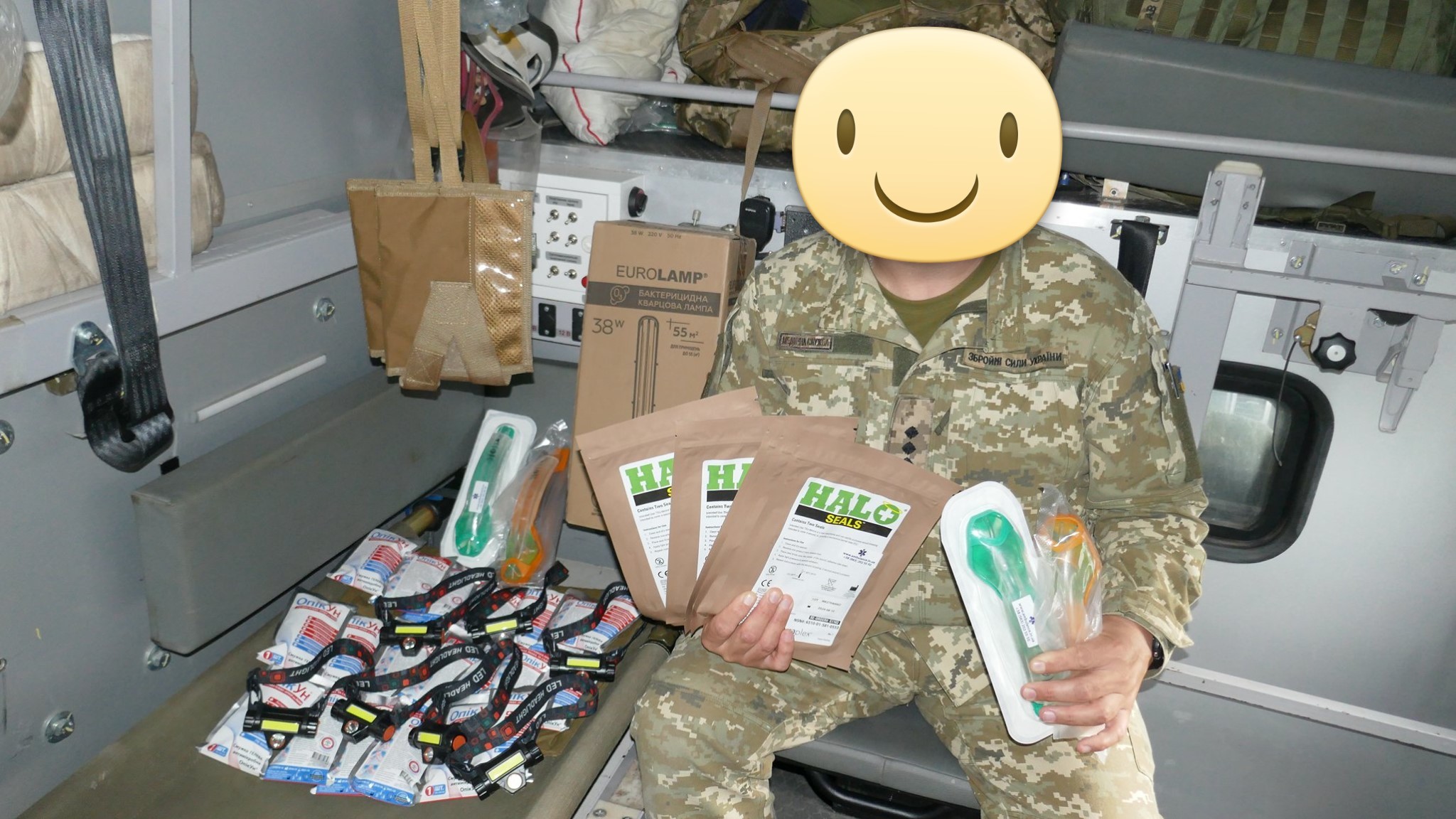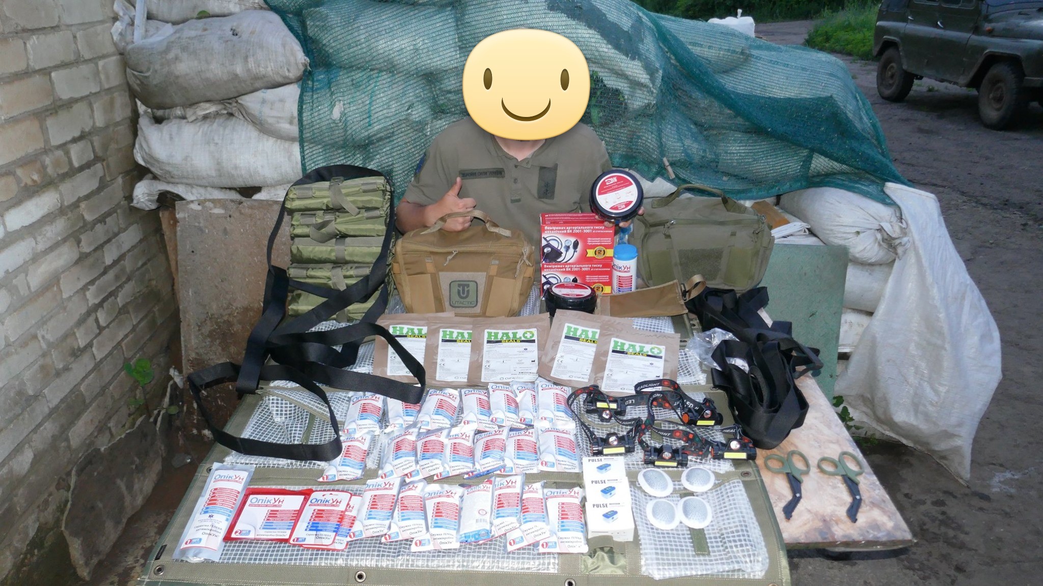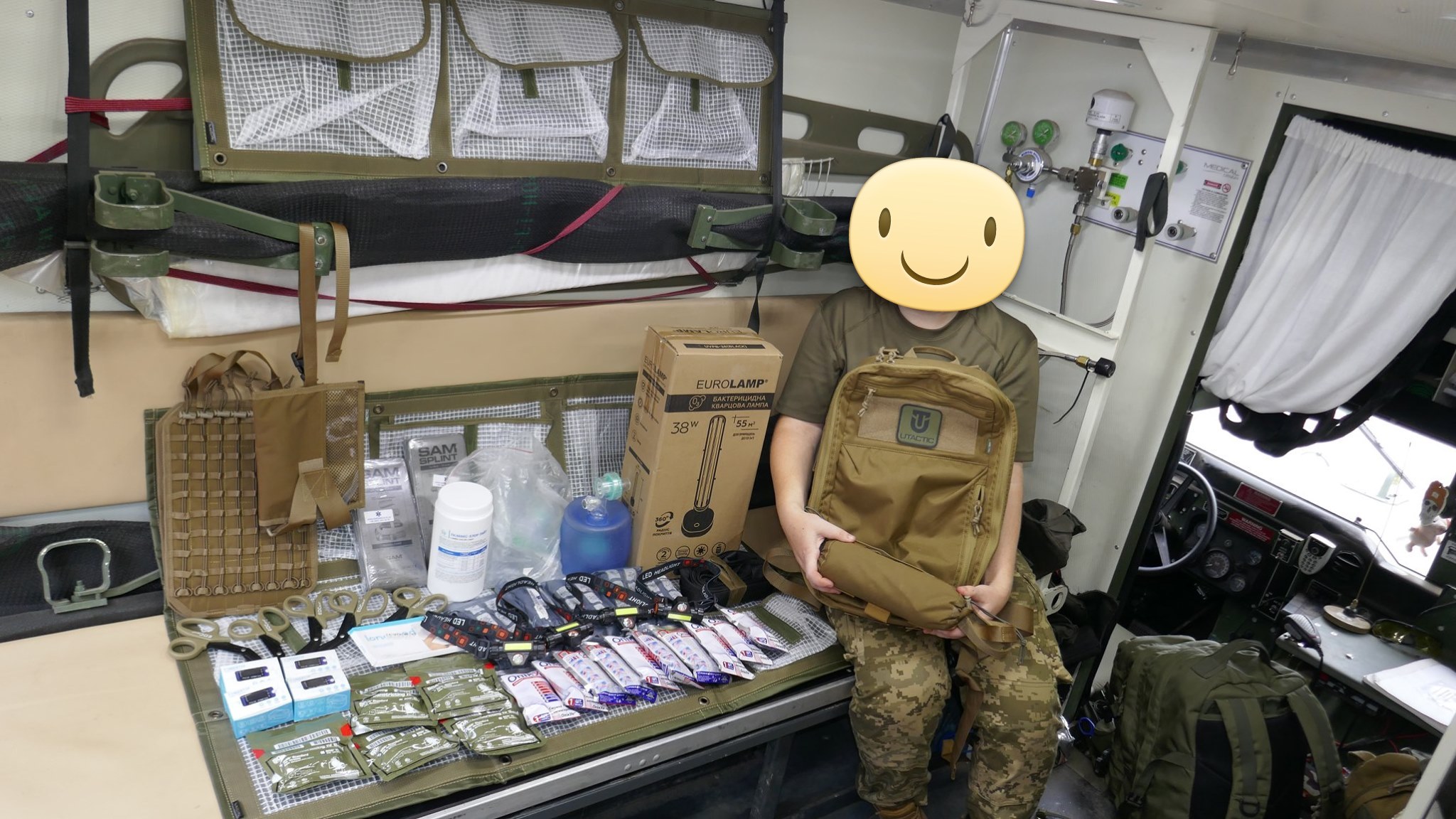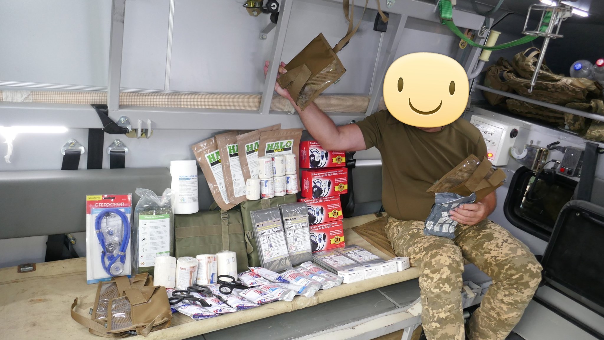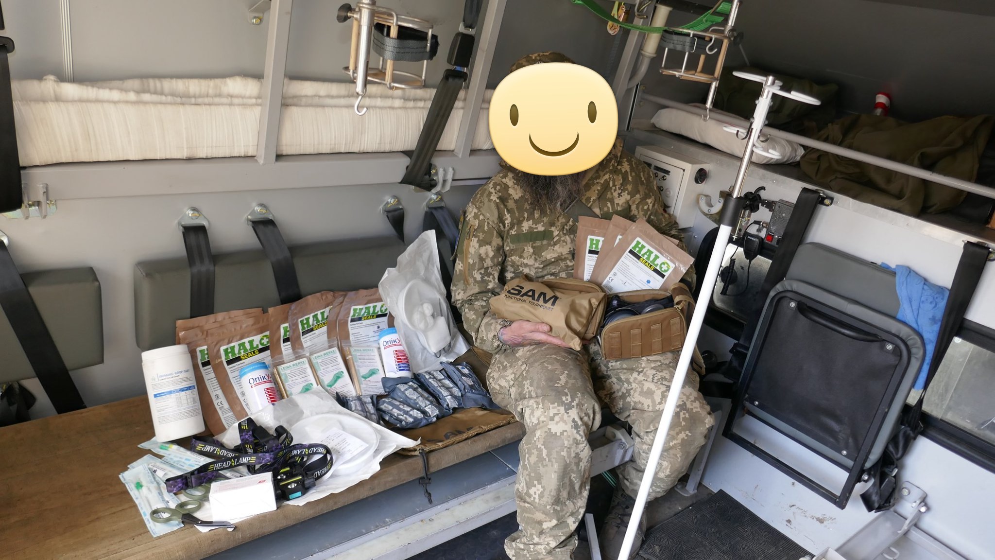 Кроме крутых рюкзаков и сумок фронтовые медики получили: 40 узловых турникетов SAM, более 100 лучших в мире венозных жгутов BOA, более 400 мягких бескаркасных носилок, 1000 противоожоговых бинтов, десятки масок I-GEL, 40 переносных бактерицидных ламп, более 400 налобных фонариков, почти 400 пульсоксиметров, сотни окклюзионных наклеек HALO, более 600 тактических шин разных размеров, 4 автоматических деффибриллятора и многое многое другое! На фото лишь малая часть нашей с вами работы!