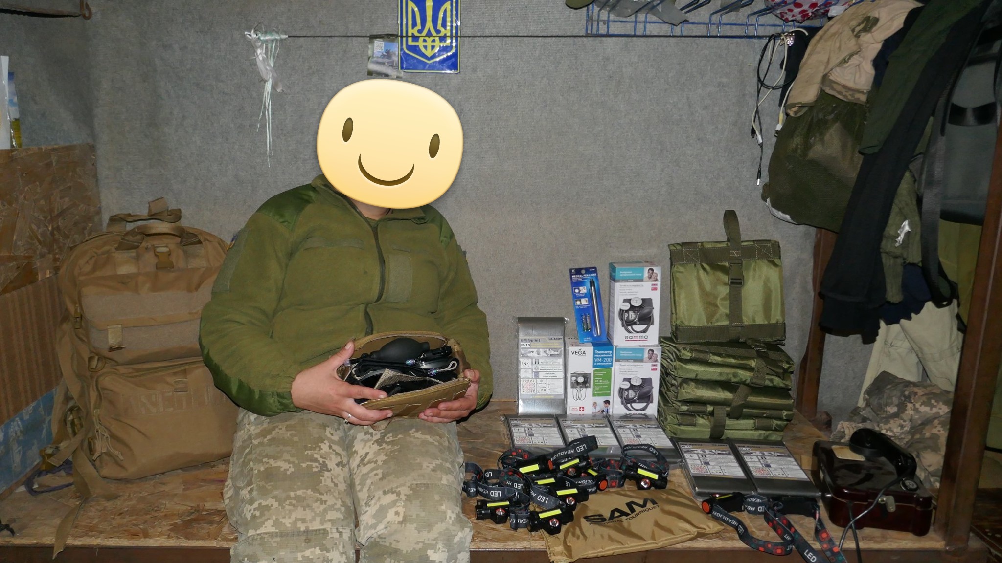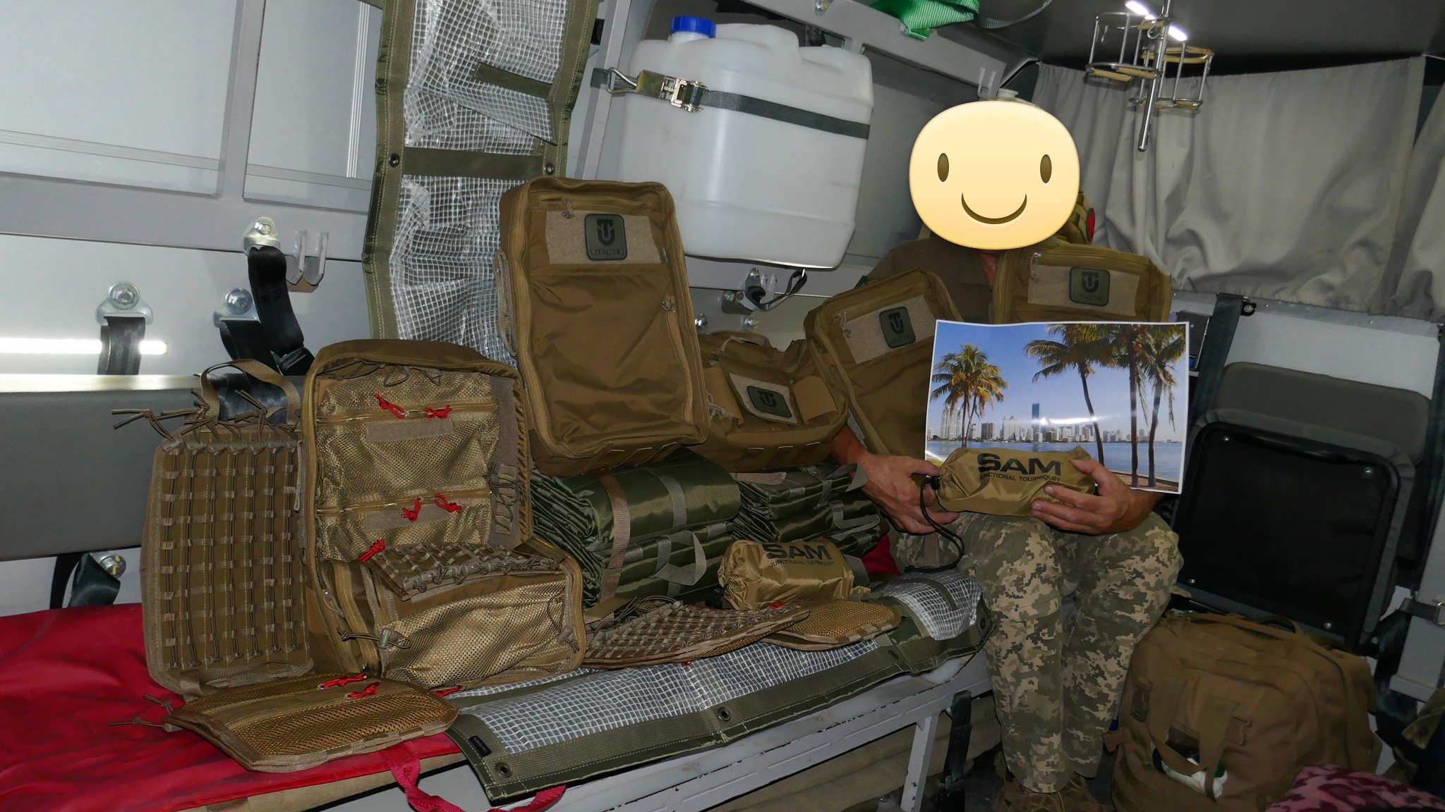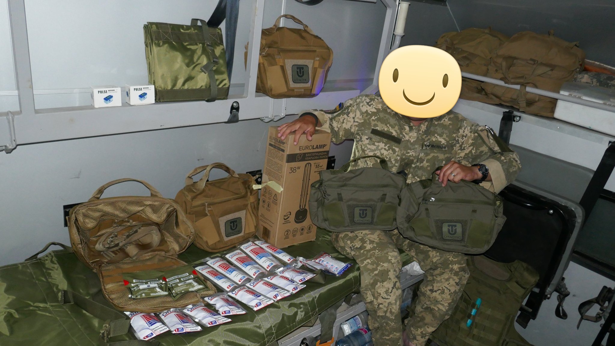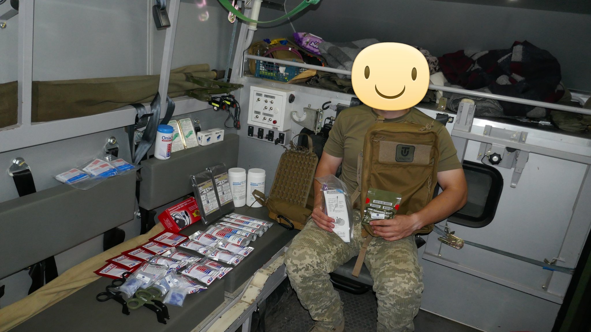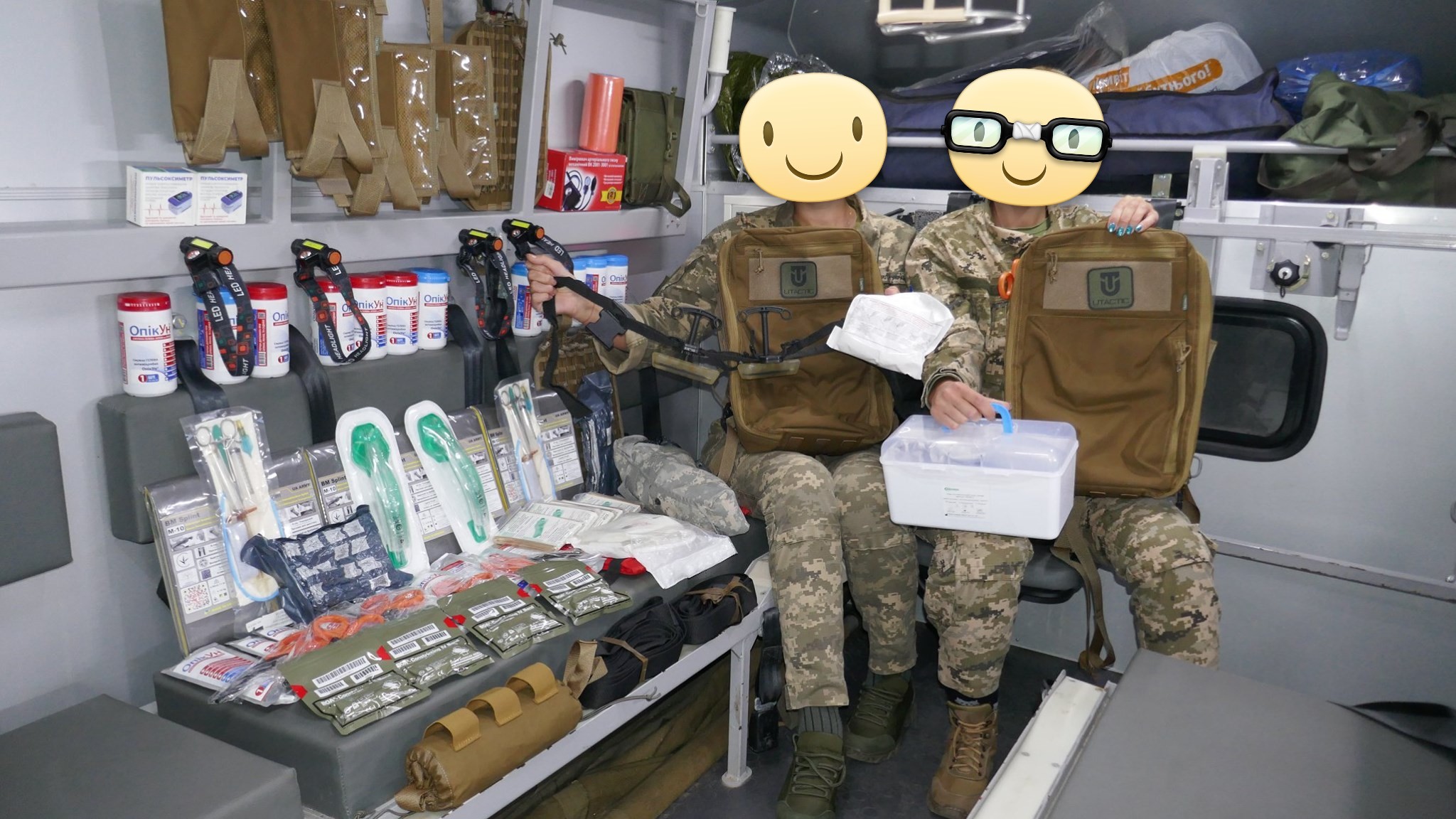 Кроме крутых рюкзаков и сумок фронтовые медики получили: 40 узловых турникетов SAM, более 100 лучших в мире венозных жгутов BOA, более 400 мягких бескаркасных носилок, 1000 противоожоговых бинтов, десятки масок I-GEL, 40 переносных бактерицидных ламп, более 400 налобных фонариков, почти 400 пульсоксиметров, сотни окклюзионных наклеек HALO, более 600 тактических шин разных размеров, 4 автоматических деффибриллятора и многое многое другое! На фото лишь малая часть нашей с вами работы!
