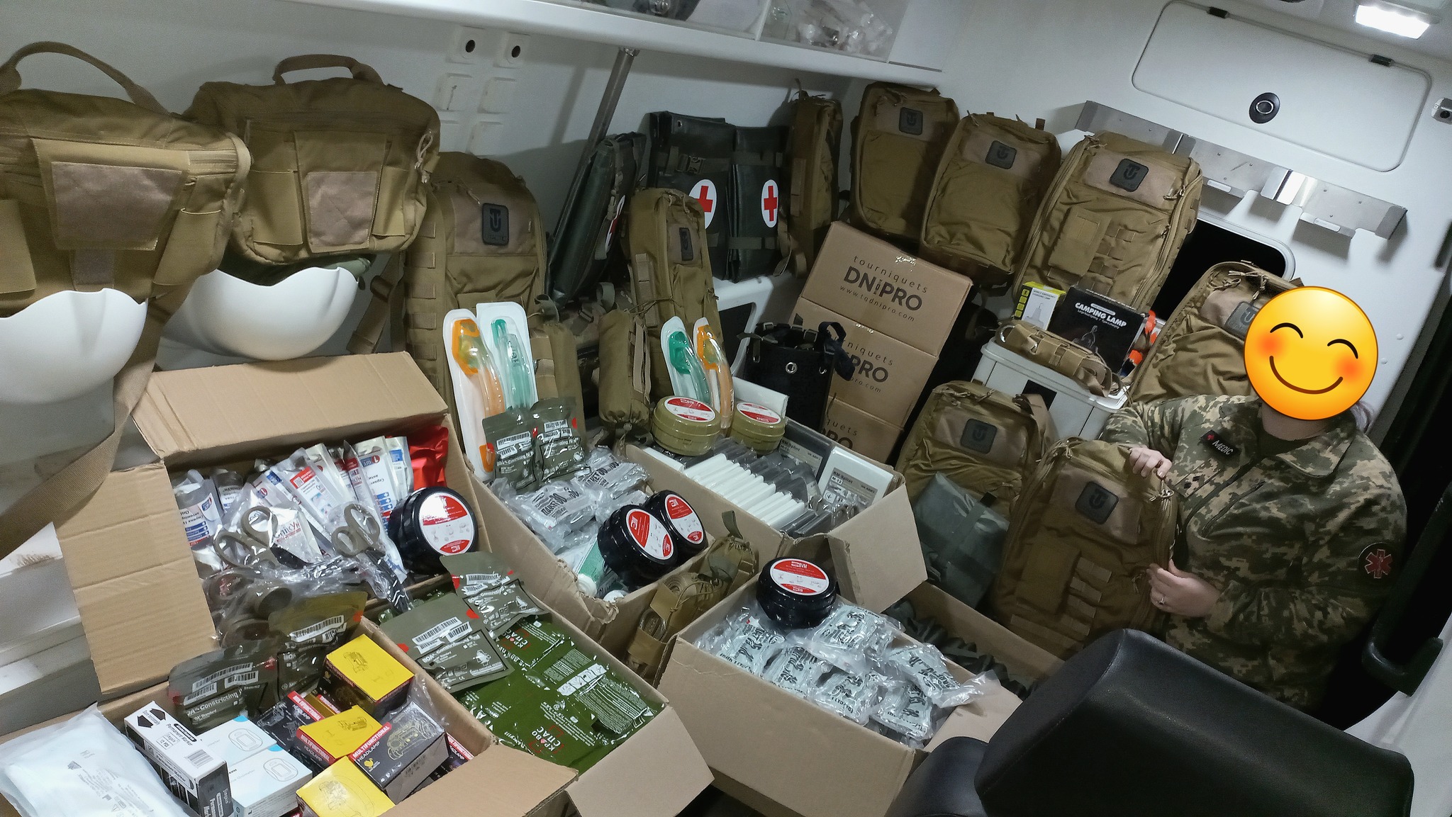 Друзья, каждый день благодаря вашим донатам мы передаем на фронт сотни турникетов, бандажей, гемостатических и противоожоговых бинтов, а также десятки медицинских рюкзаков, систем внутрикостного доступа, узловых турникетов, мягких носилок, панелей-органайзеров, окклюзионных наклеек, мягких шин и многое другое.