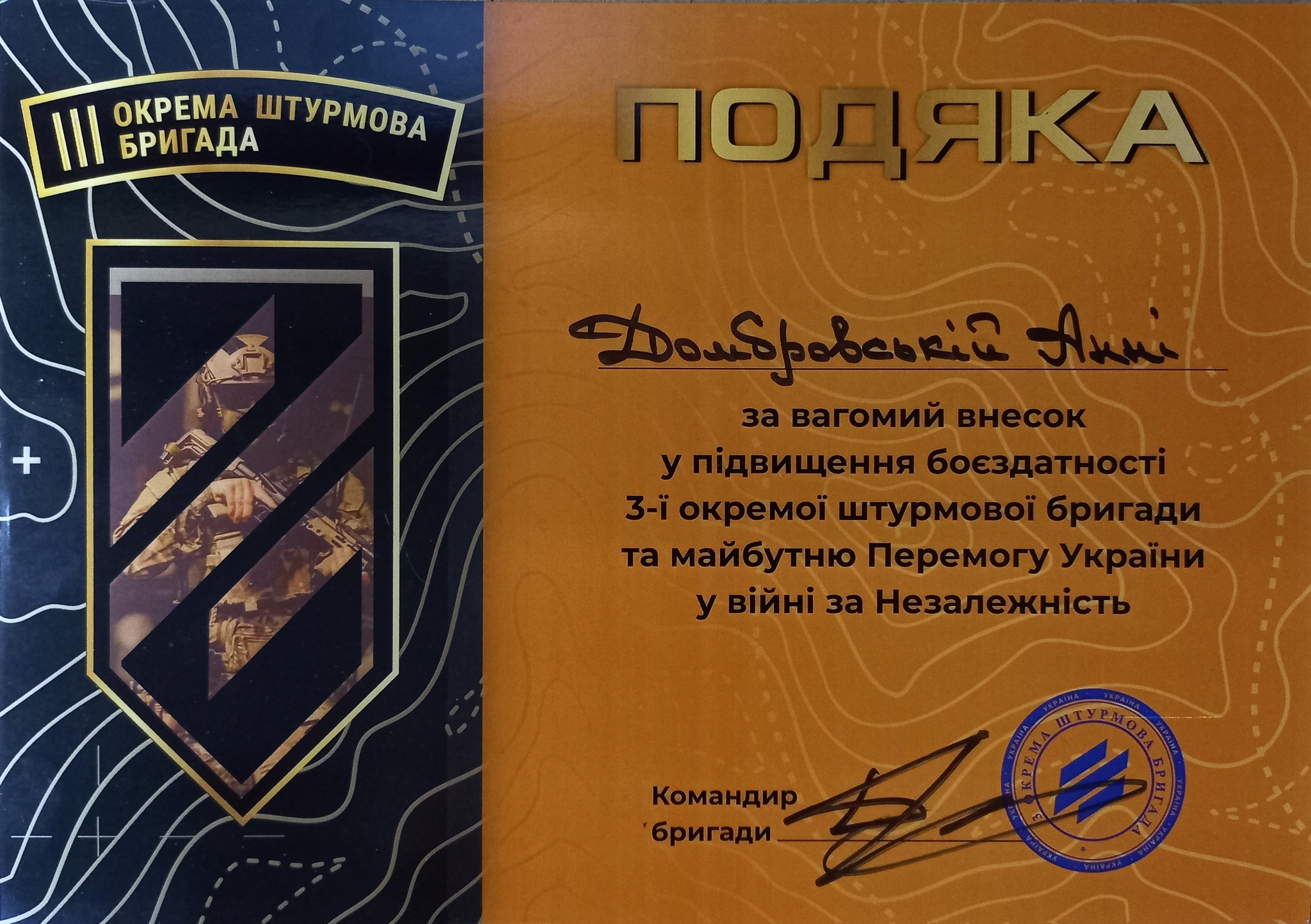 Благодарность от командования 3-й отдельной штурмовой бригады за весомый вклад в повышение боеспособности и будущую Победу Украины в войне за Независимость.